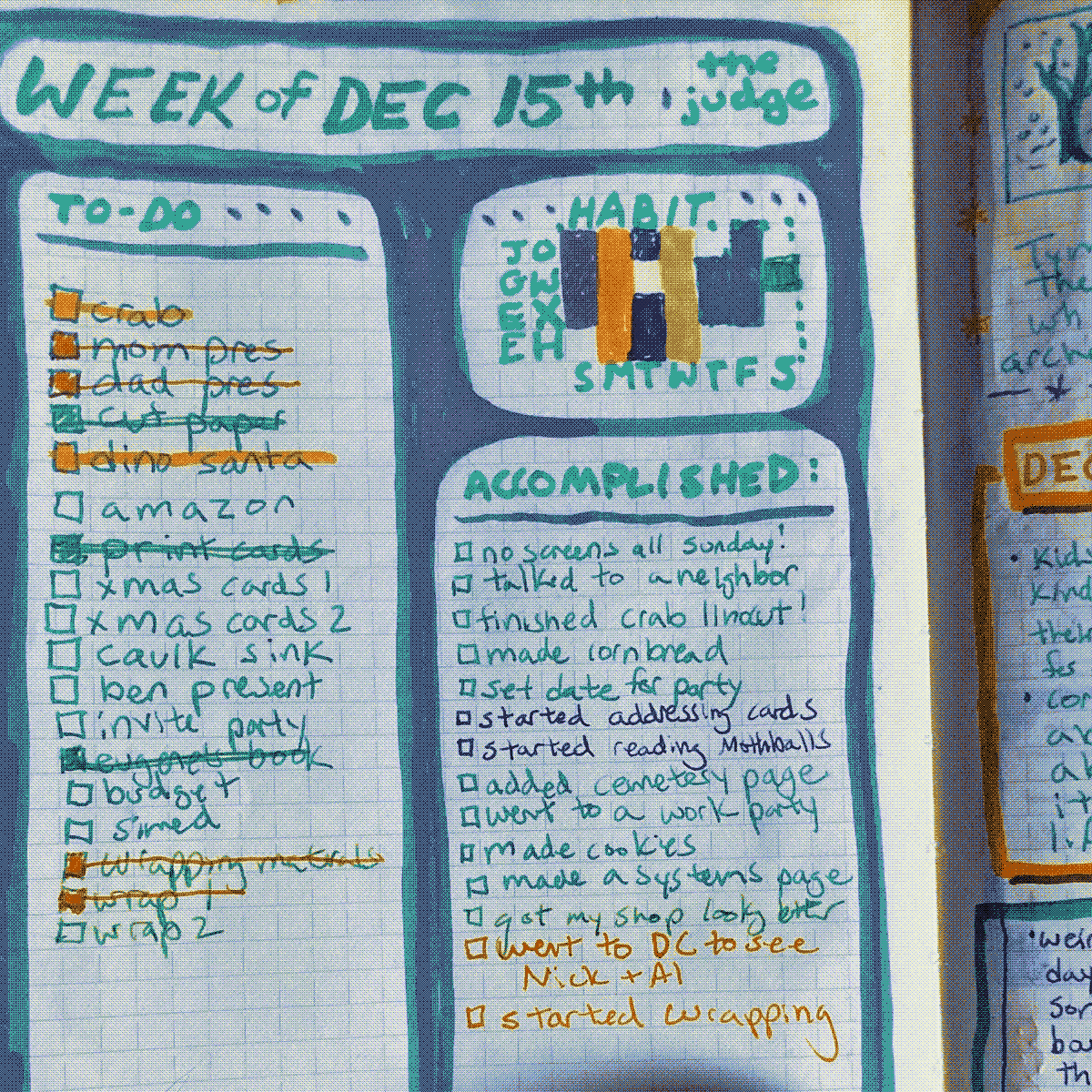 My evening journal is the fun and pretty one. Here is where I capture the events and flavor of the day with paint pens, stickers, and micron/uniball pens. I sometimes track my habits and to-do lists in this journal as well (as of this writing, I am trying out a weekly planning page with my lists, habits, and accomplishments).