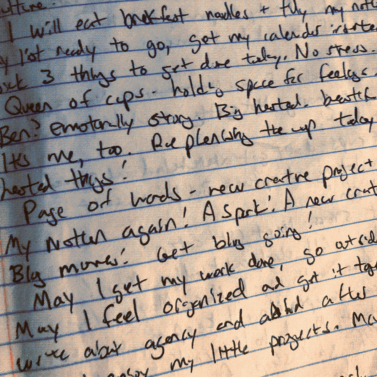 My morning journal is for processing, and is a black and white composition notebook with terrible handwriting. I take a half-hour each morning to journal, with the first half of my writing as stream-of-consciousness to clear the clutter for my mind. I finish my morning writing with my tarot pull, a vision for the day (may I feel resourced through this school day with the kids, may I not pass out during my bloodwork, etc) and it ends with a gratitude paragraph.