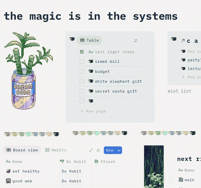 Notion is a very imperfect tool for planning and organizing pretty much anything, and for its maaany faults (slow to load, pushing AI, not e2e encrypted), I attribute it with helping me out of some creative blocks. For the last few years I start each month with a new theme and layout, decide what to track, how to organize my calendar (I use Apple calendar integration for Notion Calendar) and calendar notifications, and fill it with art or sozai to encourage me to use it.